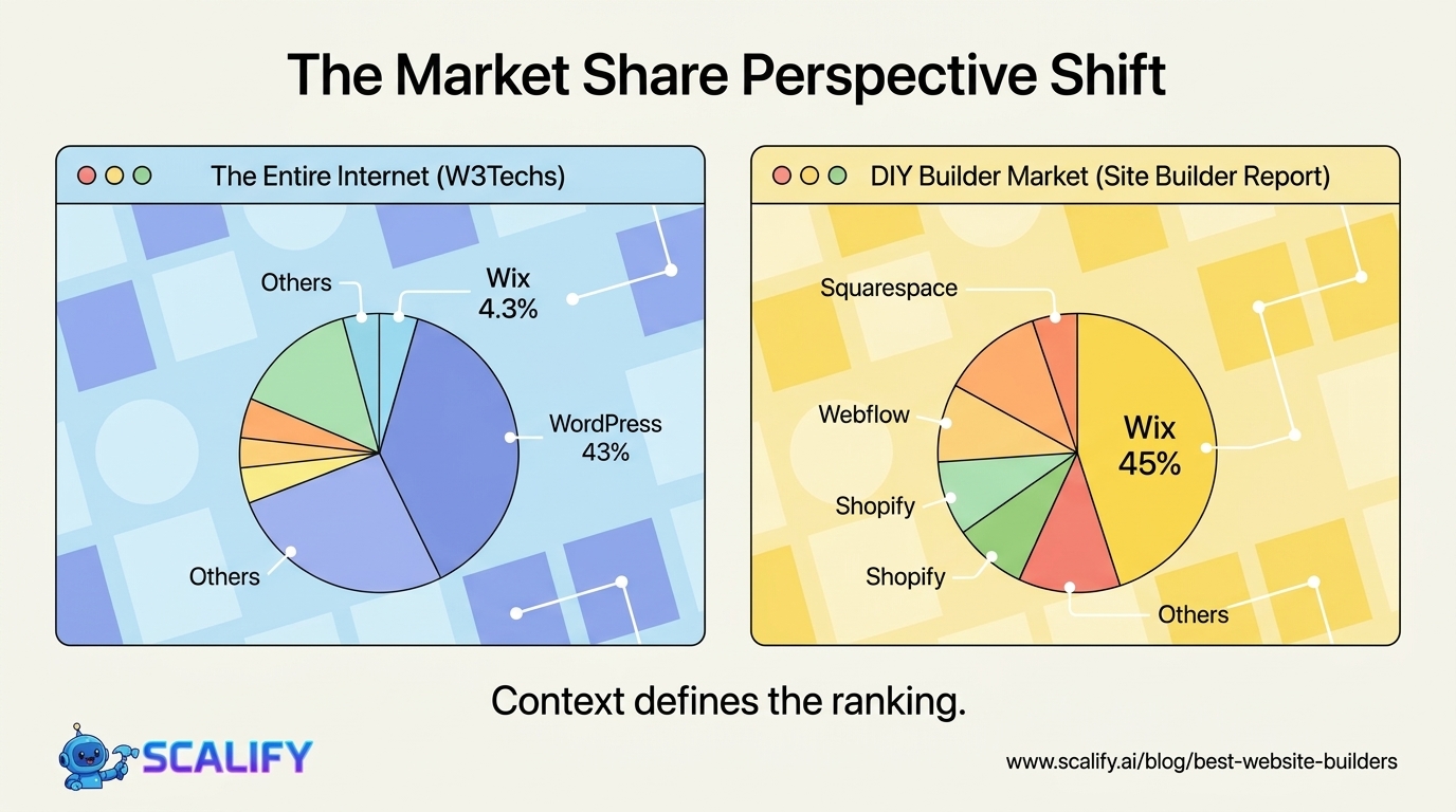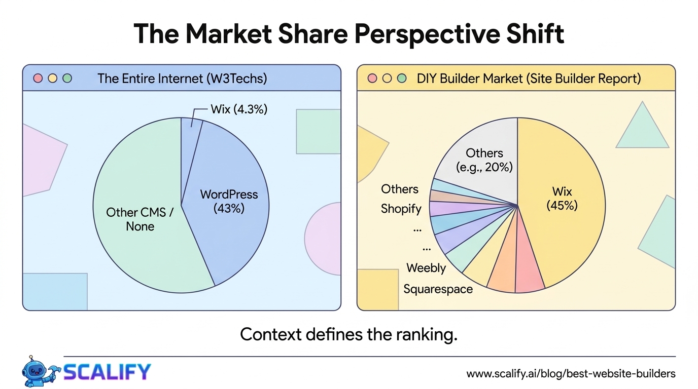 A note on the rankings: Market share data for website builders varies dramatically by source and methodology. W3Techs (which tracks all detected websites) places Wix at ~4.3% of the entire internet, while industry trackers like Site Builder Report measure "DIY website builder market share" and put Wix closer to 45%. We've ranked by overall adoption, relevance, and fit for small businesses — not by any single metric. Where we cite specific share numbers, we name the source.