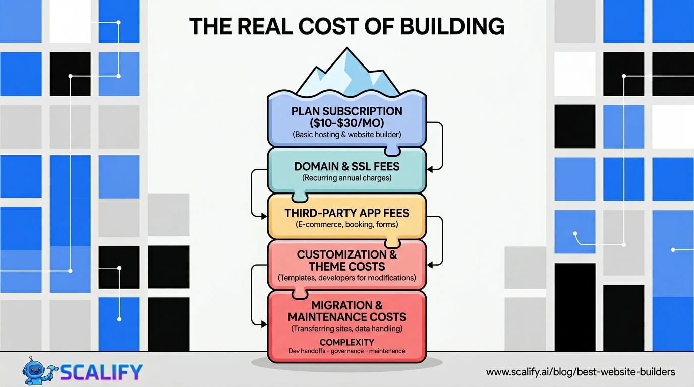 - Every platform has hidden costs: apps, domains, themes, developer time, migration friction. Plan on 2–3x the advertised price for a real business site over a year.