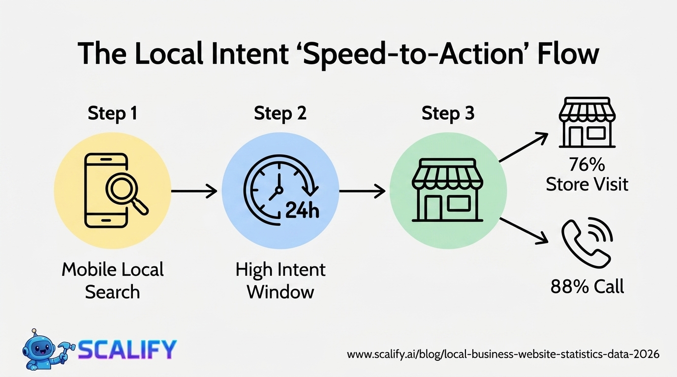 The 76% of mobile searchers who visit a local business within 24 hours of their search reinforces this point. Mobile local search is not research — it's often the last step before a transaction. A business that doesn't appear in mobile local search results (because its website isn't mobile-optimized and doesn't rank for local searches) is invisible at the highest-intent moment in the customer journey.