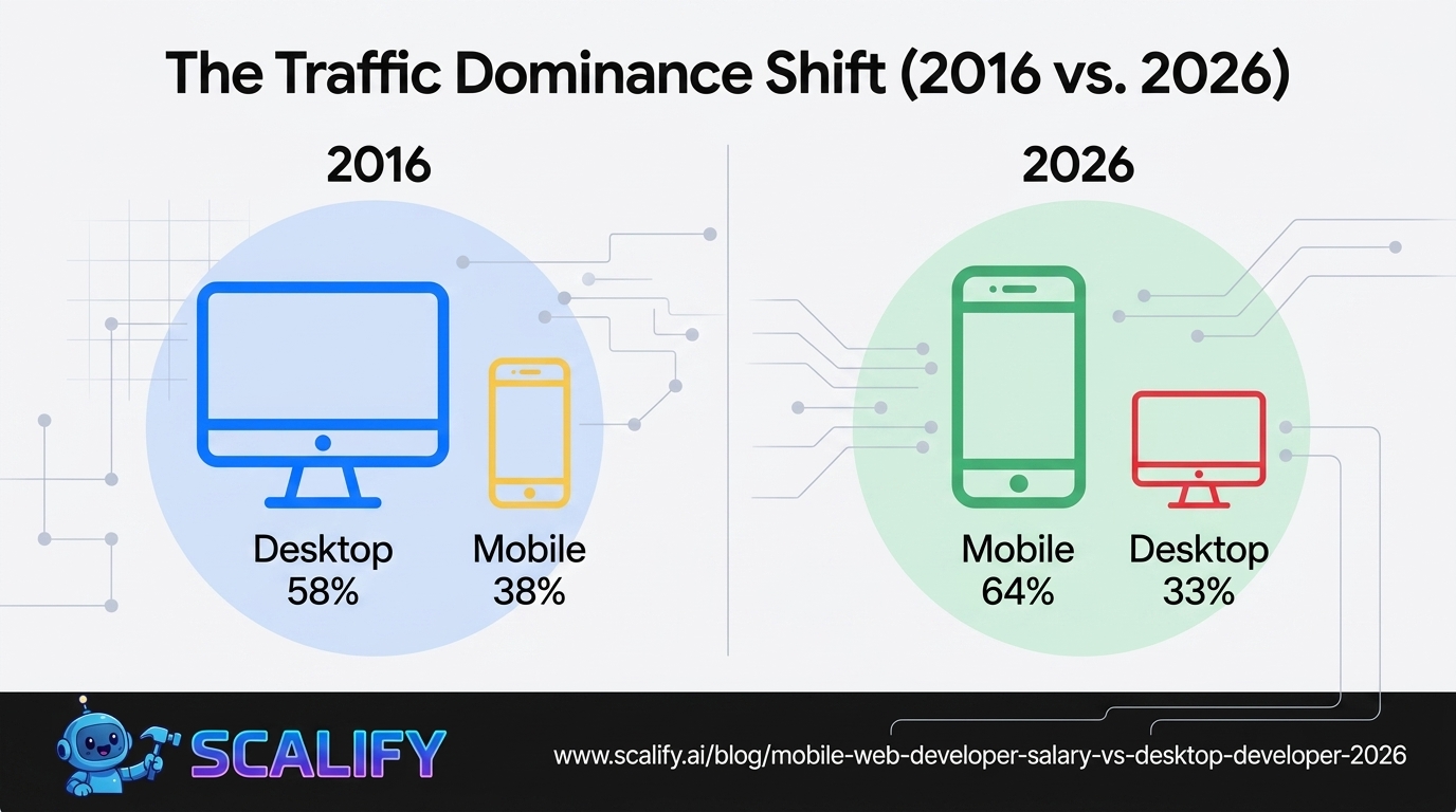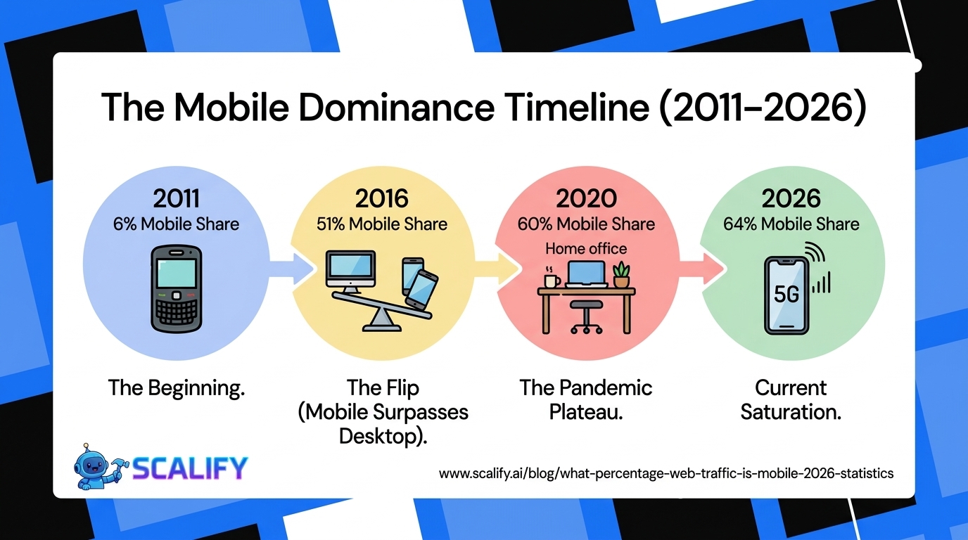 YearMobile Traffic %Desktop Traffic %Tablet %Key Milestone20116.1%90.6%3.3%Smartphone penetration accelerating201316.2%79.1%4.7%Mobile-friendly becomes SEO factor201535.1%58.2%6.7%Mobile surpasses desktop in search queries201651.3%44.0%4.7%Mobile first exceeds desktop for the first time201857.8%38.5%3.7%Google announces mobile-first indexing202059.5%37.1%3.4%COVID temporarily boosts desktop for work202260.9%36.2%2.9%Tablet continues decline202463.1%33.9%3.0%Mobile growth continues2026 (current)64.0%33.3%2.7%Gradual continued shift