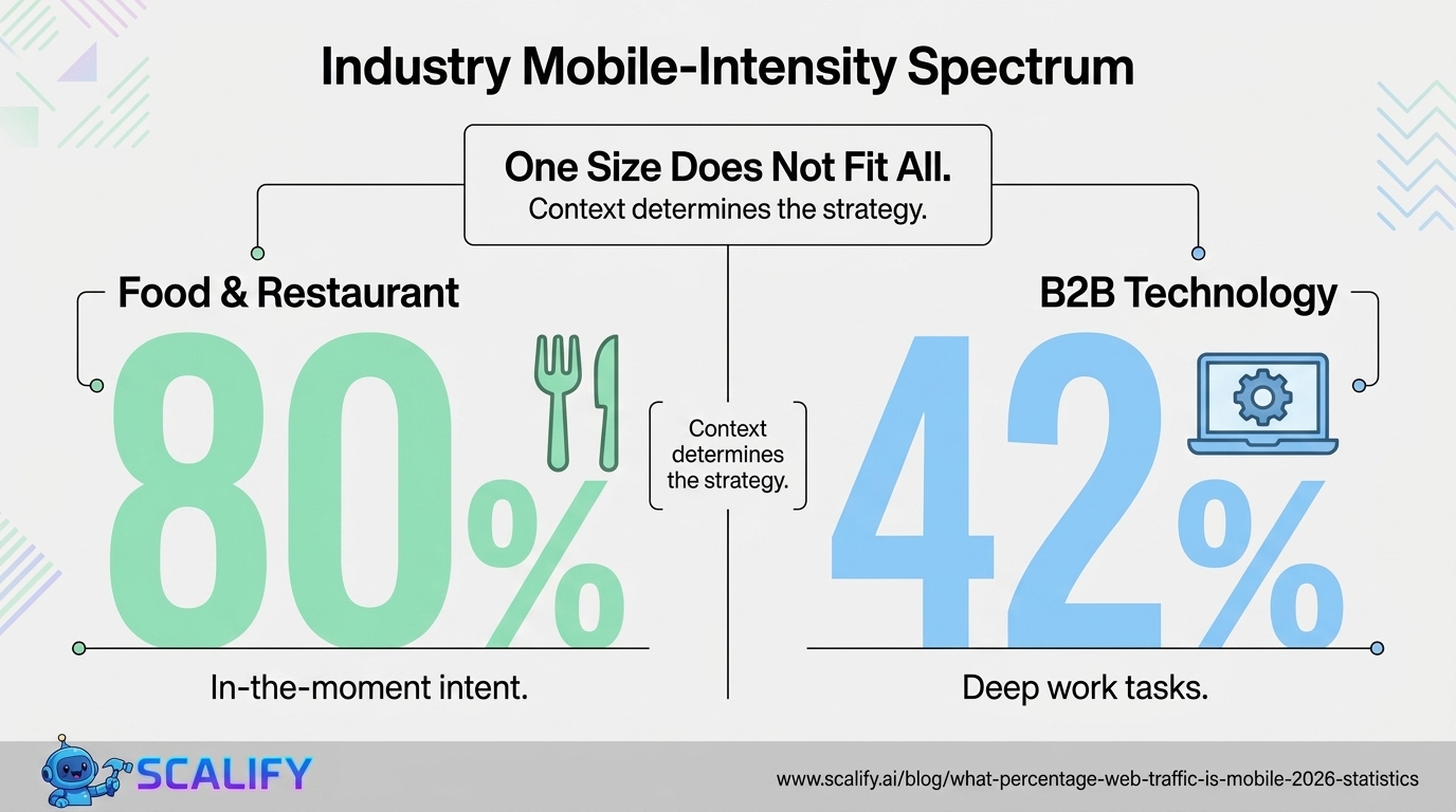 The industry breakdown reveals why the global average is insufficient guidance for individual website owners. A restaurant website sees 80% mobile traffic — meaning 4 out of 5 visitors are on a phone. A B2B software company sees 42% mobile traffic — less than half its visitors. These businesses have fundamentally different mobile optimization imperatives.