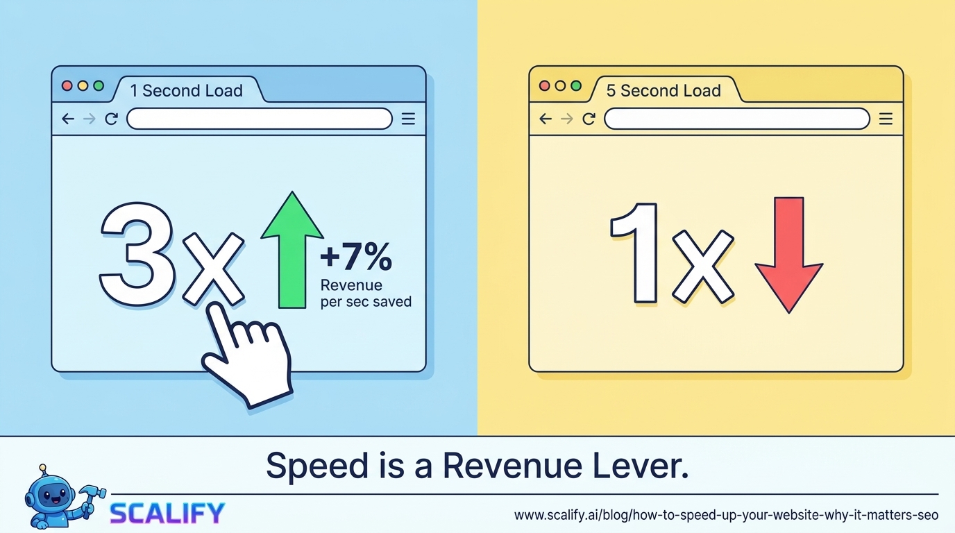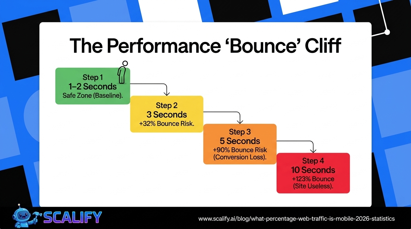 Page Load TimeBounce Rate ImpactConversion Impact1–2 secondsBaseline (lowest bounce)Highest conversion rate3 seconds+32% bounce rate vs. 1 secAcceptable5 seconds+90% bounce rate vs. 1 secSignificant conversion loss7 seconds+113% bounce rate vs. 1 secSevere conversion loss10 seconds+123% bounce rate vs. 1 secSite effectively useless