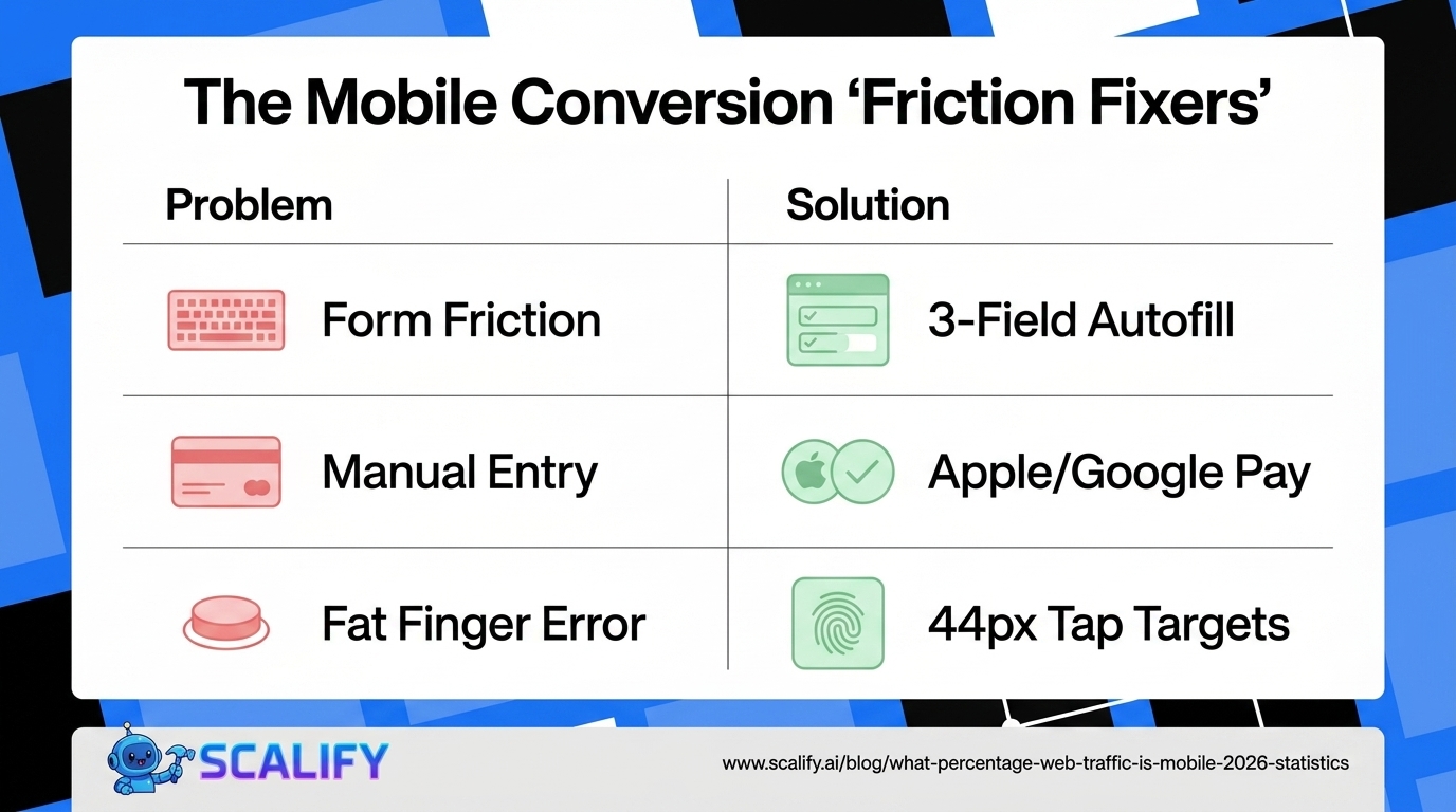 The persistent gap between mobile traffic share (64%) and mobile conversion rate (2.03% vs desktop's 3.82%) is one of the most discussed problems in digital marketing. It's not fully explained by device preference for complex purchases — research has isolated several specific friction factors: