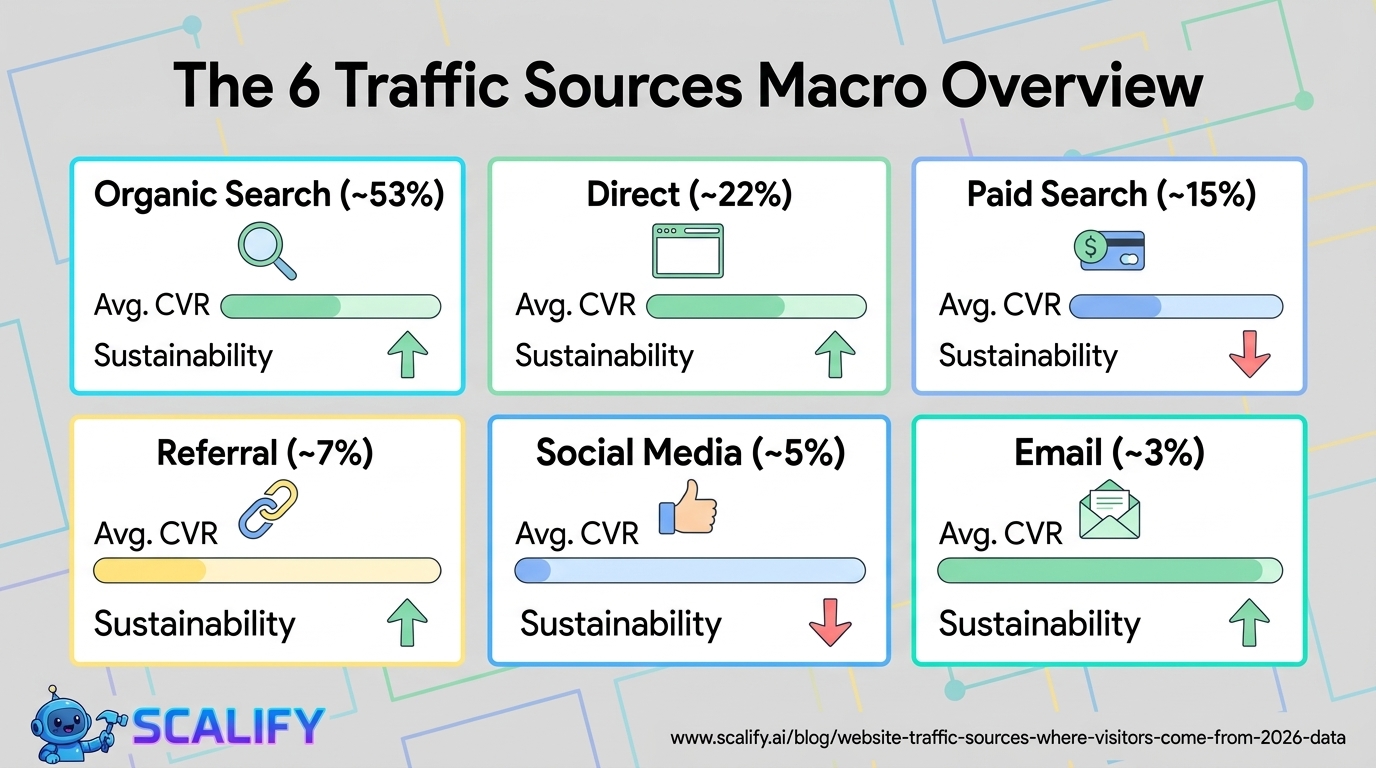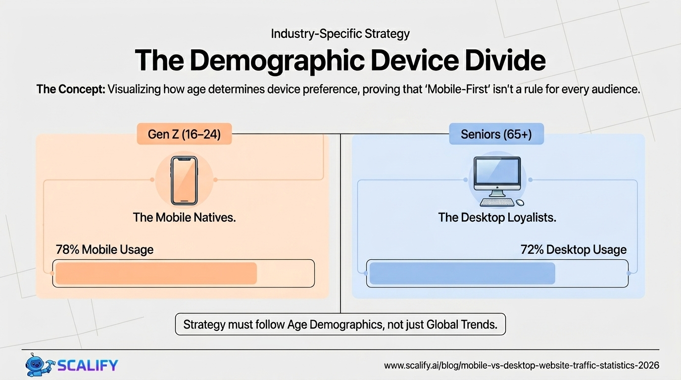 The 64% mobile figure represents a global average that masks enormous variation. In some markets and industries, mobile dominates at 80%+. In others — particularly B2B technology, professional services, and certain desktop-centric work tools — desktop remains the majority traffic source. The strategic implications of mobile traffic depend entirely on which of these contexts your website operates in.