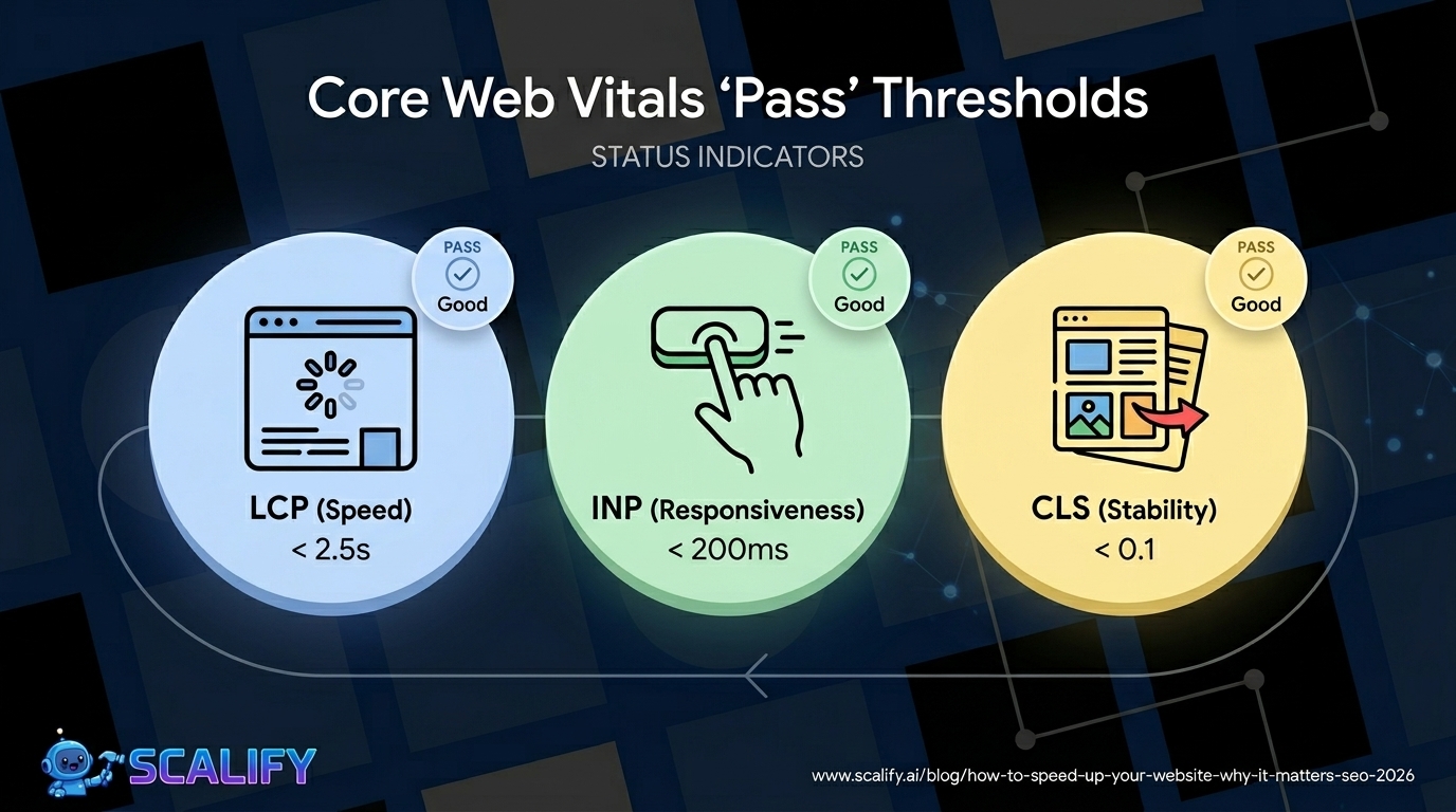 MetricGood Threshold% of Sites Passing (Mobile)% Passing (Desktop)Largest Contentful Paint (LCP)Under 2.5 seconds~46%~68%Interaction to Next Paint (INP)Under 200ms~63%~74%Cumulative Layout Shift (CLS)Under 0.1~71%~78%All Core Web Vitals (mobile)All three "Good"~39%~54%